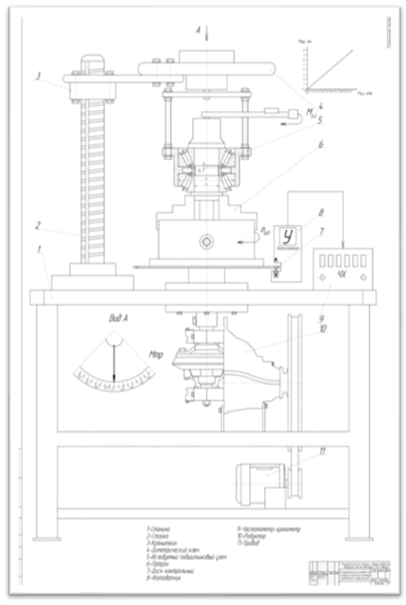 Project objective. To elaborate: the base table for mounting of all equipment, drive rotation, the bearing support for clamping the chuck, spindle assembly for securing the test site, stand for securing the device to control torque, the system of fixing the device to control the friction torque from the test duplexity bearing assemblies, the system of control number of revolution of the spindle.