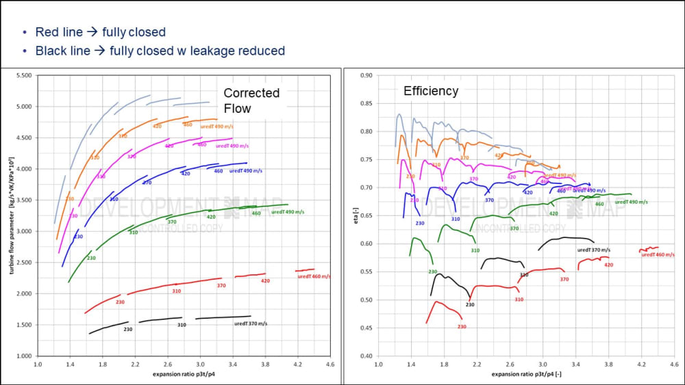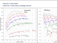Conventional multi-vane VGT’s turn into impulse turbines when the vanes start to close and there goes the efficiency. About the best efficiency an impulse turbine can produce is about 50%, whereas reaction turbines can be as high as 90%. Furthermore, there are no vanes to: