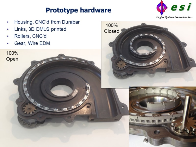 The VVT is a completely new, patented way of controlling turbine flow. It features a 720° volute that can be unwound by a flexible link system to 360°. The efficiency is stellar—beyond what any multi-vane VGT can do.