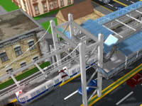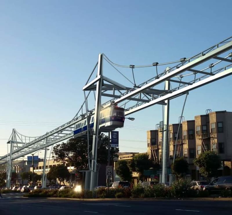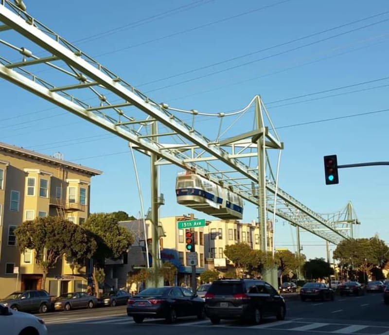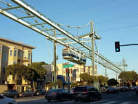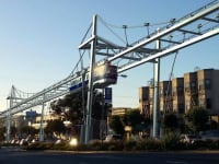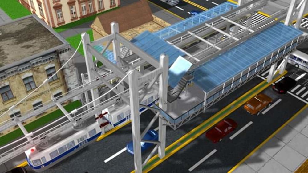 Compared to other systems, where the pylons or towers have to be placed at five or six on every block, this system uses only one pair per block... minimizing the impact on the street below as well as lowering construction/operation costs and greatly speeding up construction times.