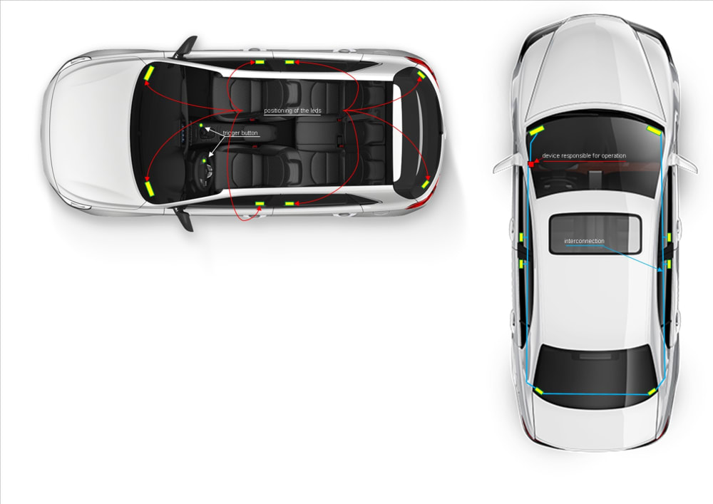 It will consist of small LED bars, of a single color that will be registered worldwide and by all manufacturers, which will be located inside the vehicle at the corner of each window as in the image, being activated by a button on the vehicle panel or the integration on the steering wheel, in modern models, which when pressed, will flash simultaneously for 2 times quickly and for the 3rd time slowly for 4 seconds, emitting a light that outside the vehicle can be seen even during very sunny days. The meaning of this device is to pass on the message of an "apology for my mistake or mistake," that whenever there is a small distraction in traffic that ends up disturbing the driver next door, the causer can trigger it as a way to avoid an argument while driving. The intention after the formalization of the device, is to create campaigns all over the world, each country, each state and city in its own way, informing drivers, what it is, what it is for, how to use it, so that a worldwide awareness of this new technology for cars, being able to extend to motorcycles, trucks and other means of driving and with certainty for the vehicles of the future. Today is just an idea, but tomorrow it could be the new peace device in traffic.