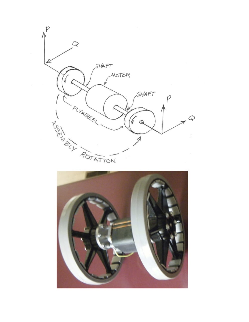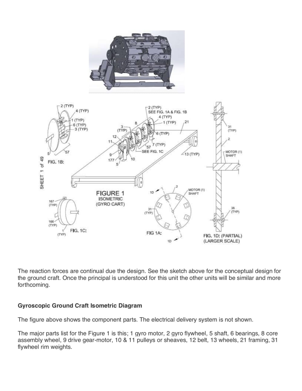 The Secret? There is none, except in the manner and orientation of the powered rotating bodies. Matched pairs of gyros are connected and continuously driven by central motor(s) or engine(s), at the identical gyro rotational speed (RPM), geometry and mass. This condition by itself, however, is much akin to a conventional engine and transmission operating in neutral. As spinning tops, such units tend to remain like toys in static balance, and provide no motive force for useful propulsion. By the addition of one more surrounding element of mechanical activity, however, these assemblies can be induced to release their rotational energies into powerful and potentially useful driving force. This is accomplished by placing the matched pairs of gyros within the framework of a moderately rotating core assembly, moving in the axis of another plane (wheels within a wheel, See our video and Ezekiel 1:16). And almost as if by magic, the active result of this is analogous to putting a conventional transmission in gear, thus our Gyroscopic Reaction Drive!