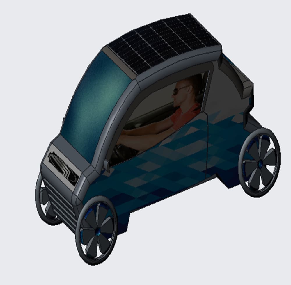 Purpose of the idea: the creation of an advanced and economical solar-powered electric vehicle that does not pollute the environment, and also uses a motor wheel. The task of the idea: to create environmentally friendly and economical transport. The object of the idea: a solar-powered electric car using a motor-wheel. Hypothesis: to trace the possibility of creating such an electric vehicle design, as well as to reveal the future of this electric vehicle. Novelty: charging using two sources (electric energy and from a solar battery), controlled by autopilot, the use of motor wheels.