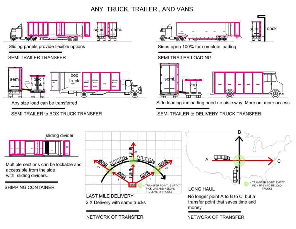 The new system will decrease warehouses and be closer to customers. The innovation will use current adaptive technology and be economically installed onto current semi-truck trailers, box trucks, vans, shipping containers, and future vehicle units. An additional benefit of this design will allow distribution to urban areas without large depots and to remote areas without loading docks. This “sideways trucking” and “AnyWareHousing” advances the use of robotic arms, integrated material handling, reduces labor challenges, allows for “drive-thru” distribution centers, improves air quality, and eliminates backing up the vehicles. It also orchestrates inventory with A.I. technology allowing the controlled transfer of load from vehicle to vehicle.