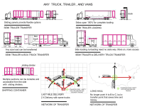 The remote smooth transfer to small vehicles will extend the daily last-mile delivery capabilities by expanding the spokes of the regular delivery radius circle. Partial loads will are eliminated on long-distance hauling because of the ability to transfer loads at exchange points. Transportation will become more linear and streamlined with air, sea, and ground models to reduce handling and sorting. Large and small fulfillment centers can pre-load items without concerns about the placement of the load being prioritized by the sequence of the delivery locations. The loading of the vehicles are currently collated and prioritized by the “first items on, are the last items off” and is restrictive. This system provides flexibility and last minute alterations to a complex logistic model. The universal use of the complete side-loading vehicle will accelerate local deliveries and the global logistic networks, the same way oversea shipping containers and semi-trailers have made significant improvements in the way we all live.
