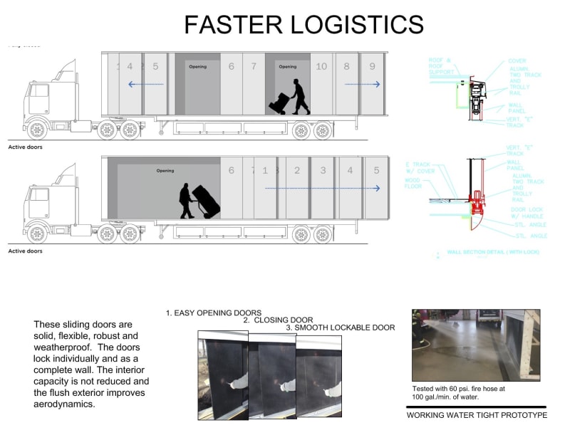 With the rapid expansion that is taking place with e-commerce and world markets, the delivery element needs to be refined, because it involves every aspect of our lives. From consumer discretionary and staple items to materials and equipment, the existing trucking industry can be improved. This innovative design will not only improve on loading/unloading trucks, saving valuable time but will expedite long-distance hauling, all the way to the last mile delivery. This product will provide an improved system to help create the future.