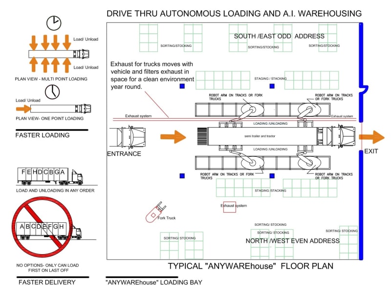 The new system will decrease warehouses and be closer to customers. The innovation will use current adaptive technology and be economically installed onto current semi-truck trailers, box trucks, vans, shipping containers, and future vehicle units. An additional benefit of this design will allow distribution to urban areas without large depots and to remote areas without loading docks. This “sideways trucking” and “AnyWareHousing” advances the use of robotic arms, integrated material handling, reduces labor challenges, allows for “drive-thru” distribution centers, improves air quality, and eliminates backing up the vehicles. It also orchestrates inventory with A.I. technology allowing the controlled transfer of load from vehicle to vehicle.
