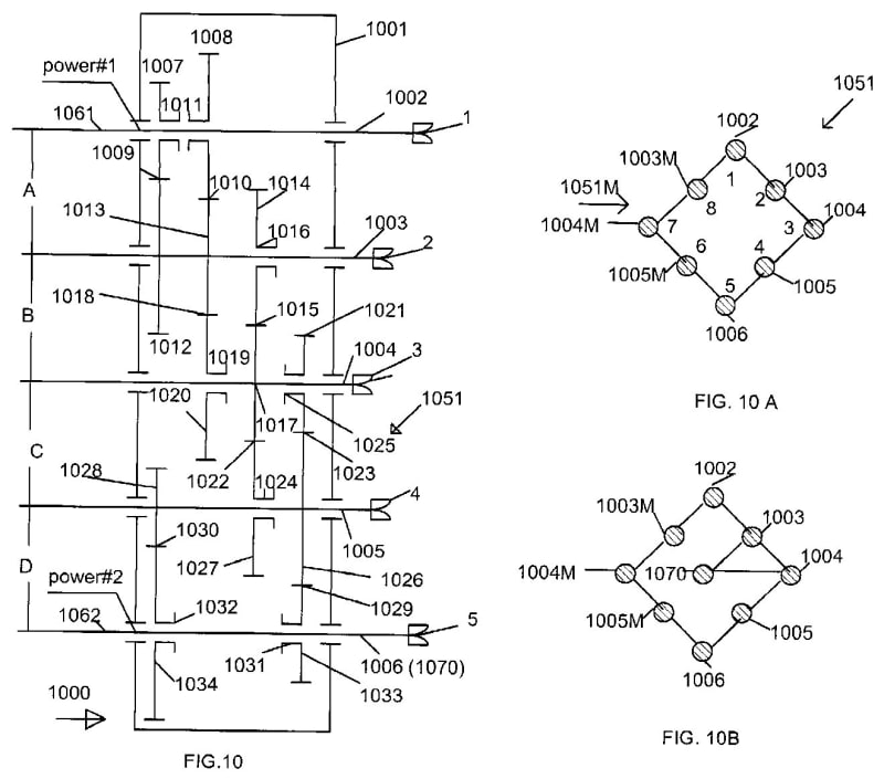 It gets 7 independent shafts. Each supports 2 or 3 pair gears is shifted by said simple gear-shifter that easy gets automatic system. Therefore, shifting mechanism integrates 7 simple automatic gear-shifters. There GA also opens opportunity to use smaller cheapest motor that replaces existing motor if GA is installed in the existing accelerating propulsion.