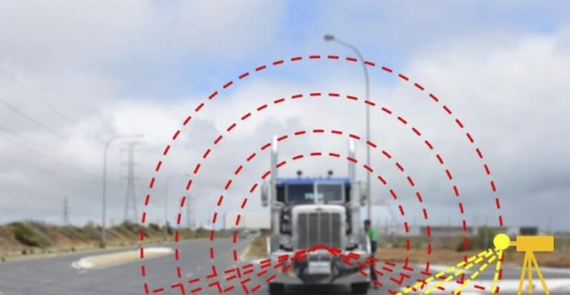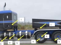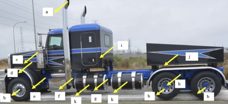 Heavy vehicles generate high noise levels that are increasingly put under control limits. Prominent noise generating sites from (a) to (i) in the Figure are the exhaust, tyre tread, air inlet, upper engine belts an drives, base engine, transmission, auxiliary gearboxes, rear axle and air turbulence from the cabin. Resonance from (j) and (k), empty box trays and fuel tanks can magnify the noise generated.