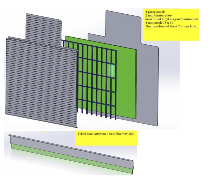 The barriers for hanging down below the chassis are a combination of acoustic audio perforated plate, an air gap and mass filled vinyl backing a steel plate. They hang down to the lowest level of the fuel tanks in order to control sound wave diffraction by producing Fresnel values as large as possible.