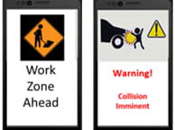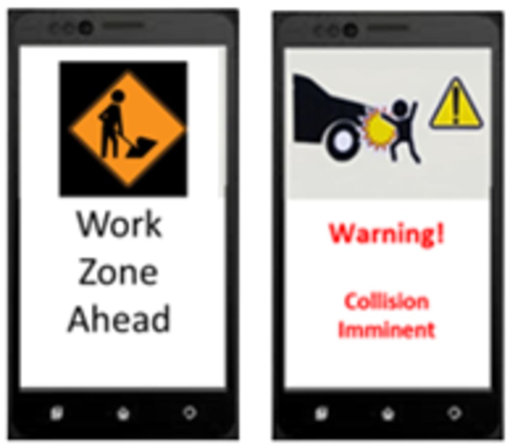 Current practice relies on the utilization of active and passive measures to reduce vehicle and pedestrian incidents. While these approaches are helpful, their effectiveness is limited by roadway occlusions such as trees, cars, and adverse weather, which restrict the visible range and make it difficult for laser- and radar-based systems to distinguish between pedestrians and other roadway objects. The proposed system will utilize dedicated short-range communications (DSRC) systems mounted on vehicles and worn by roadway personnel to alert workers and vehicle operators of impending struck-by incidents. This strategy is expected to provide enhanced information exchange between workers and vehicles (both traffic and construction vehicles). The DSRC technology will be embedded within the workers’ apparel to determine the presence, location, and trajectories of workers and respective strike threats. Although cellular and Bluetooth communications will be targeted for application in this project (Figure 1 warning), human-machine interfaces (HMIs) will be developed to be communication-agnostic, to the extent possible (Figure 2). This will enable their ready transition for use in areas with DSRC coverage. In the configuration shown in Figure 2, the cell phone may be used independently or linked to a built-in interface to improve timely warnings.