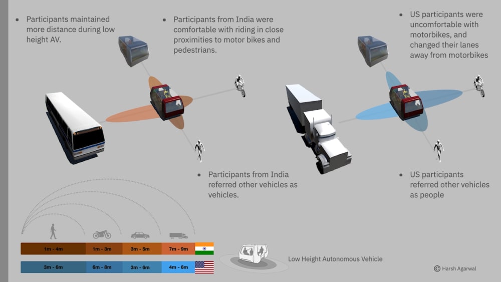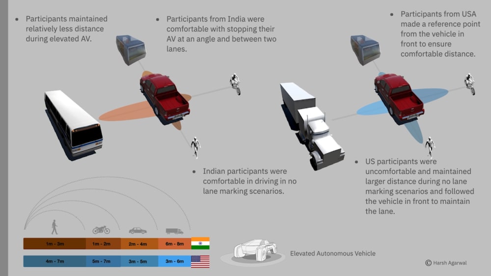 Elevated autonomous vehicle scenario for India were participants from India had an elevated and hubris perspective when it came to elevated autonomous vehicles. Participants have relatively less proximity with pedestrians (1m - 3m), motorbikes (1m - 2m), and cars (2m - 4m) and higher proximity boundaries with semi-trucks (6m - 8m).