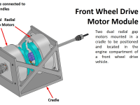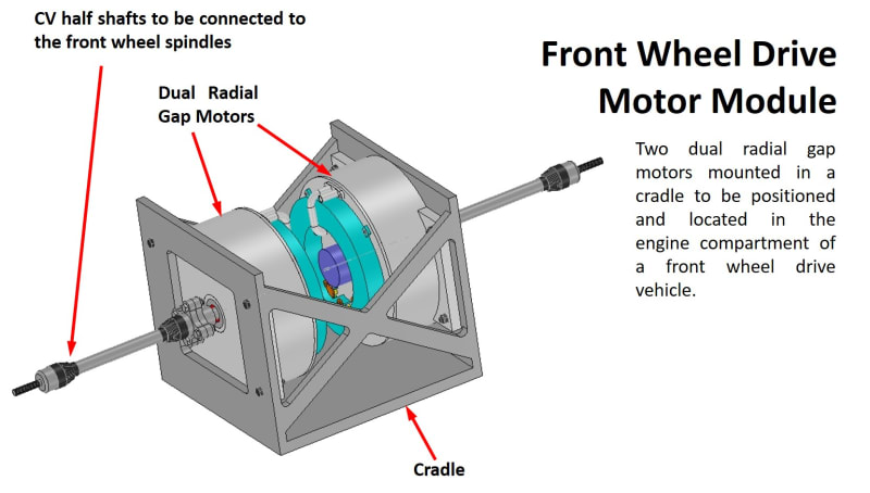 For front wheel drive, the power-train consists of a compact dual motor system. Two dual electric motors, one for each wheel, will be mounted back-to-back in a cradle. It will be a direct drive application with no intermediate gear reduction units. The motors will be attached directly to the wheel hubs, by two constant velocity half shafts and individually controlled by two independent motor controllers whose power and torque would be coordinated by a central processing unit.