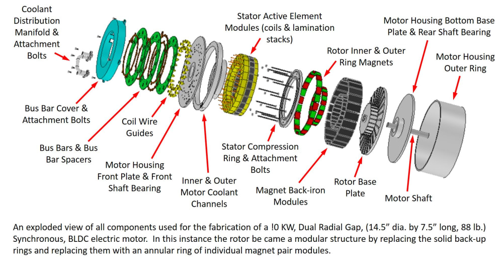 The motors are based on a dual radial gap architecture, This architecture is unique in that the motor has a donut shape. It features a rotor, with a channel shaped cross section that contains two separate opposing annular rings of magnets, each one attached to the two inside horizontal surfaces of the channel. The rotor is operationally attached to and rotates around a stator core centrally positioned within the two rotor magnet rings producing two separate additive radial torque components. This architecture demonstrates twice the power density of a conventional DC electric motor. It is essentially two motors in one, both an inside and outside rotor incorporated within the same machine. My motor also employs a unique modular architecture that simplifies its design, keeps initial tooling costs low and allows for full automated assembly.