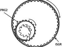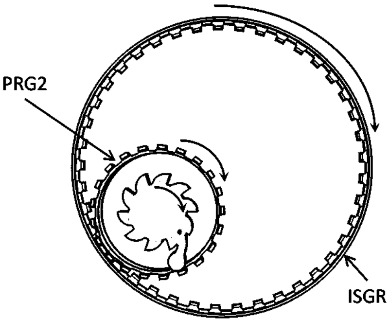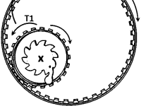 Three planetary gears (P1), (P2) and (P3) and a Sun gear (S) is journalled to carrier plate via ball bearings. U shaped pegs are attached to carrier plate in the space between the planet gears.