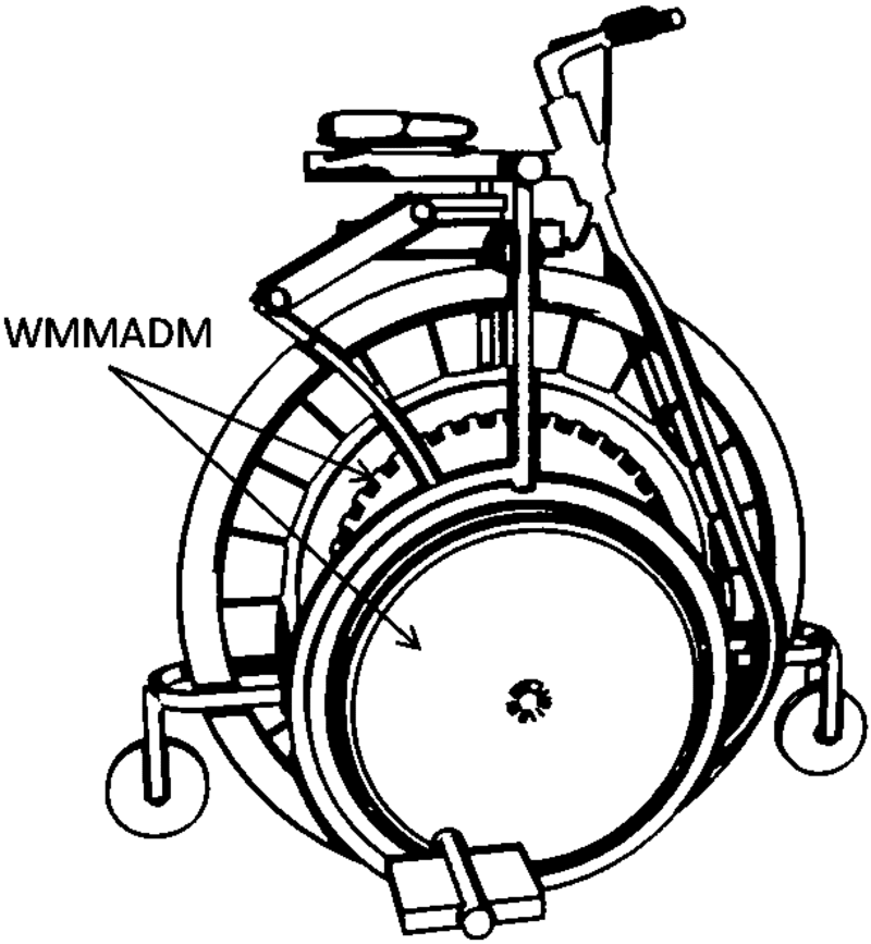 Basic idea: Use internally toothed gear to rotate the hub of the wheel. It also uses part of rotation energy of the wheel for anti-tipping mechanism.