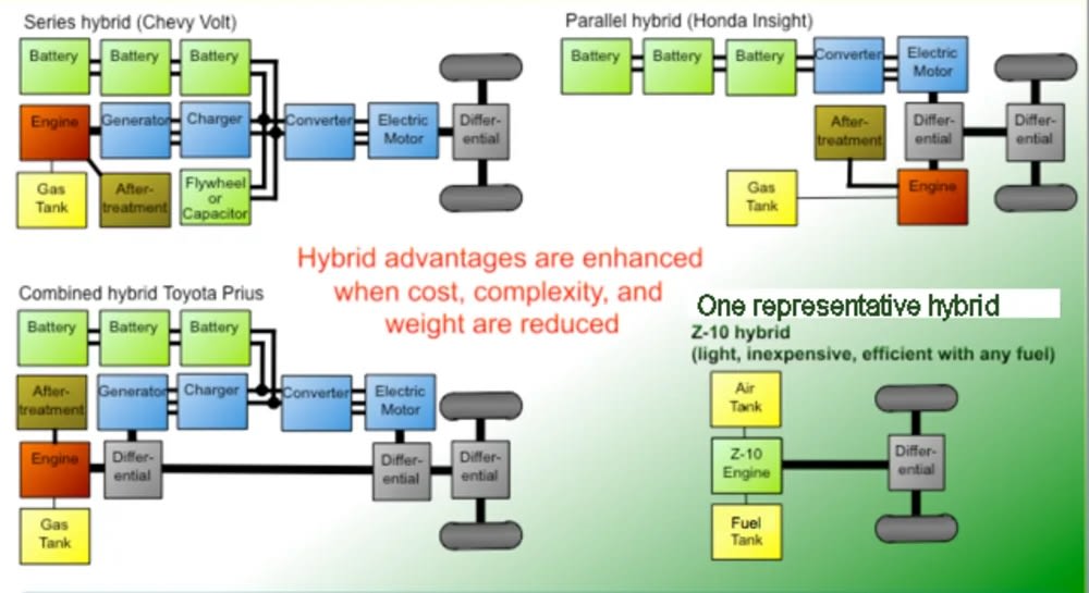 The built in non-electric hybrid capacity has no weigh/cost/hazard, charging time and range penalty of electrics. 150% the fuel efficiency of conventional vehicles in real world driving cycles and better than electrics in a life-cycle analysis. Nothing out but lower CO2, but w minimally processed bio-fuels or hydrogen this is a zero-sum event. This is HUGE! Retrofits of existing engines are possible!!!