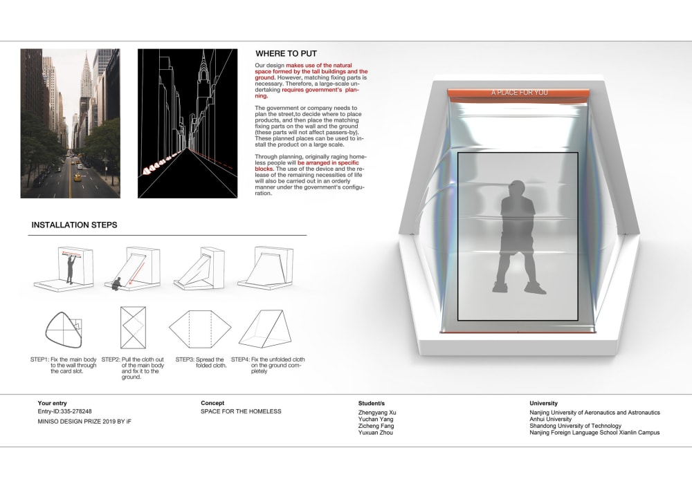 It can effectively help the homeless and provide them a place to sleep and rest with the least cost. This will let them realize that society and the government have not forgotten them. In additional, we design it a temporary place, which we hope can bring them courage to integrate into this society.
