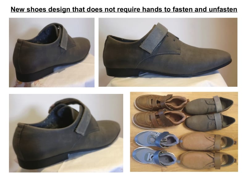 Clasps of the shoes open from the inside of the foot. On all existing shoes, fasteners are on the opposite side. Furthermore, our shoe samples have outer part of the fastener is specially made of copper, which rapidly extinguishes COVID-19 virus.
