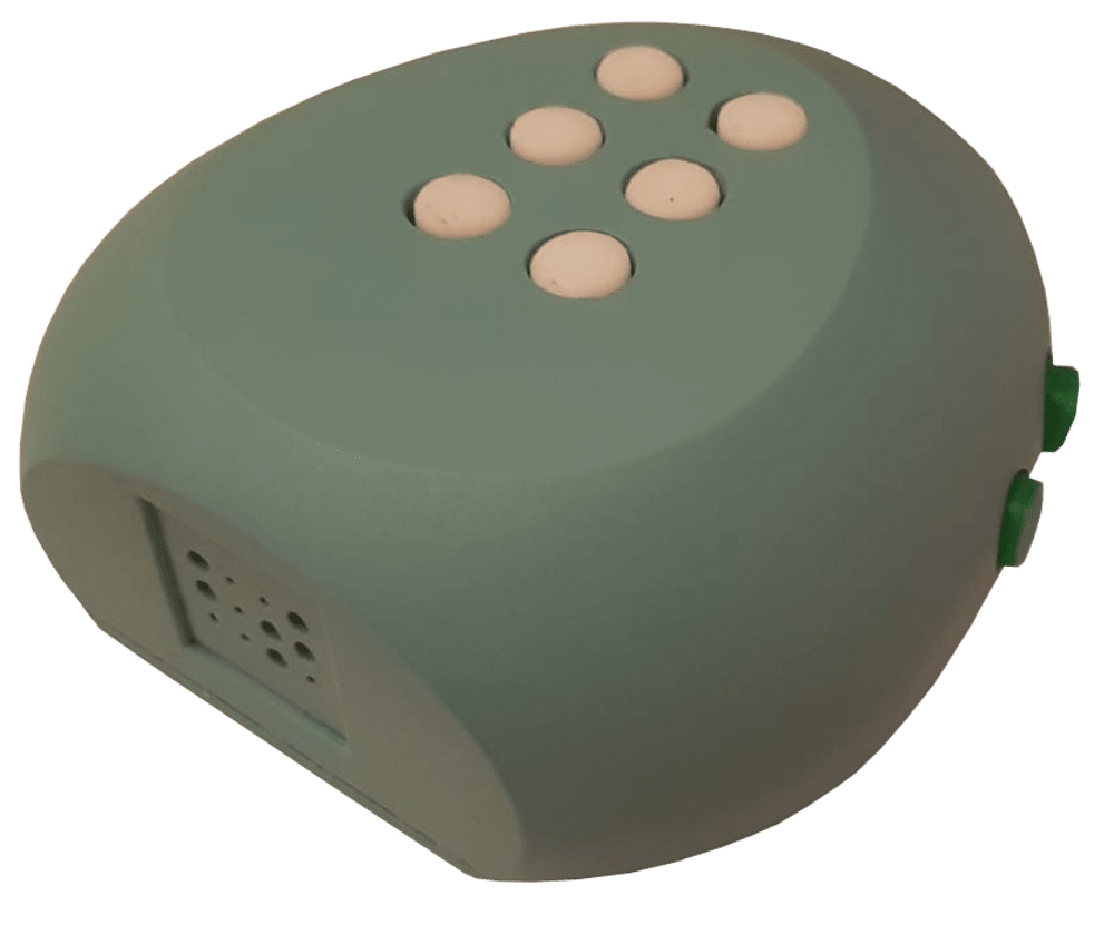 This is a pocket size, rechargeable device with 6 Braille alphabet simulation buttons on top and 4 operations buttons on side. The top buttons are toggle buttons, which keep it state (up or down) when pressed on it. Buttons imitate Braille six-dot letters by 10x increased size. Like, for letter “A” or number “1”, you need to keep first button up and all others down.