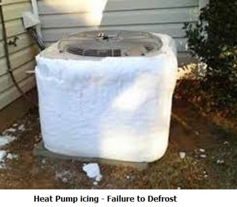 In winter months when the Heat Pump is in use the system might fail to defrost itself. This causes icing (see photo) of the outside unit and unless noticed by the homeowner this unit will run and not heat the home or business efficiently. Most systems have back up electric heat strips. They'll run up an electric bill and it's a surprise to most homeowners that have a failure like this. The power companies know this well as most checked electric meters are operating correctly.