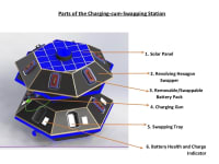 The design consists of a completely functional Charging Station for electric bikes and cars. In this design the inspiration is taken from the shape HEXAGON which has six sides. The six sides have been utilized to provide a charging tray for multiple batteries at once. Users can swap their batteries and also charge their batteries from this multipurpose charging station. Two hexagonal battery swappers are provided for charging and swapping more batteries. The user can simply remove the battery pack of his vehicle and enter the data on the station screen and swap another battery with same specification from the tray. The top tray in both hexagons are rotating trays for ease of reach for the user. The top tray rotates and user can easily pick or place his battery. If the user wishes to charge his battery instead he can do so by simply using the charging gun provided.