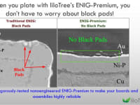 ENIG-Premium involves inclusion of a proprietary barrier layer (nano-engineered) at the Ni-P and immersion Gold interface which leads to smoothening of the Ni-P interface and passivation of the surface which increases corrosion resistance by 10x. Then, when our proprietary immersion Gold deposits onto the barrier layer-treated Nickel, there's no black pad formation [Img2 and Img3].