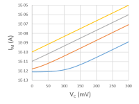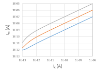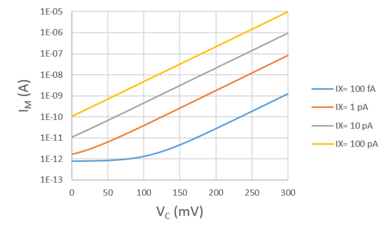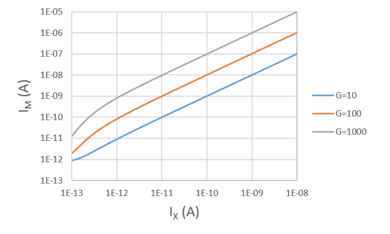Fig. 1 illustrates the circuit with BJTs. Thermal compensation is done by Q3 and the amplification by Q1 and Q2. Figs. 2 shows the amplified current as a function of the unknown current for various gains and Fig. 3 the same parameter as a function of the voltage that determines the gain for various input currents.