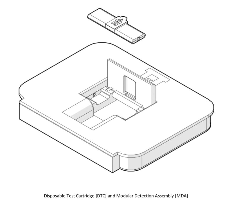 Modular Detecting Assemblies or MDAs are self-contained assemblies that include all of the required optical light sources, light detectors, and electronics needed to perform a presence test with the help of a cartridge. All MDAs have a built-in cradling area dedicated for the disposable cartridges. These cradling areas are designed to help align the cartridges with the light sources and light detectors inside the MDA; they also help hold the cartridges in a secure and stable position for testing purposes; and they also provide some protection against external environment changes. Every MDA is designed specifically to a particular type of DTC, they are also designed to electronically pair-up with all UECs, regardless of the UEC model.