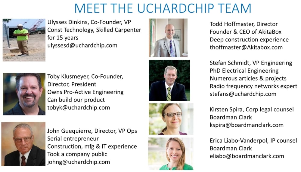 Carpenter and entrepreneur Ulysses Dinkins formed UCHardChip in 2016 to develop and sell personal protective equipment (PPE) like hardhats that enable hands-free communication with embedded electronics and supporting software to improve safety and productivity in the construction industry, among the least safe and productive in the US. The products will be sold to general contractors and subcontractors.