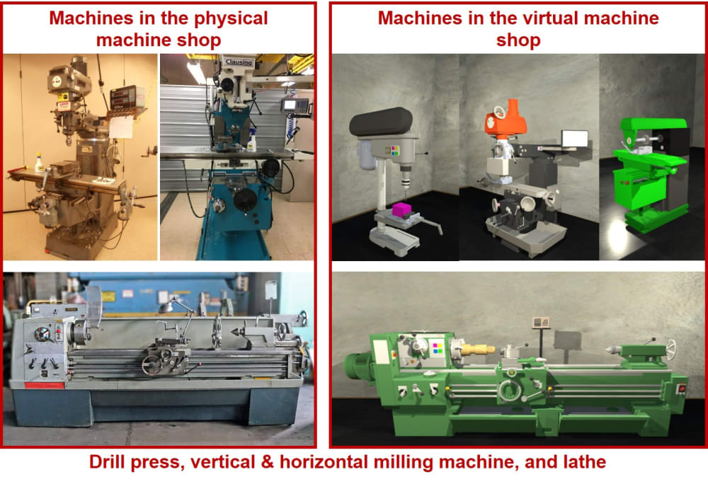 Utilizing virtual reality (VR) technology is a promising solution such that students can operate the machines in a virtual environment similar to physical lab setups. In our SVRS, users can see machines and parts in a created virtual environment through the Unity game engine development tool with a first-person view. The constructed 3D models of different machines in SVRS delivers the end user a perfect experience in the virtual environment. Buttons on the machine simulate the function of real machines to provide feedback as the user pushes buttons on machines. Users can pick up parts, hold the part, mount on the vice holder, turn on the machine, turn off the machine, and other interactions with the machine. The educational design would navigate student’s attention to focus on learning to practice operating machines. Students can learn and follow content in the software without extra instruction, which saves time and effort of instructor/TA/staff as well. The VR app can be offered for Oculus VR goggles, android apps and computer interface.
