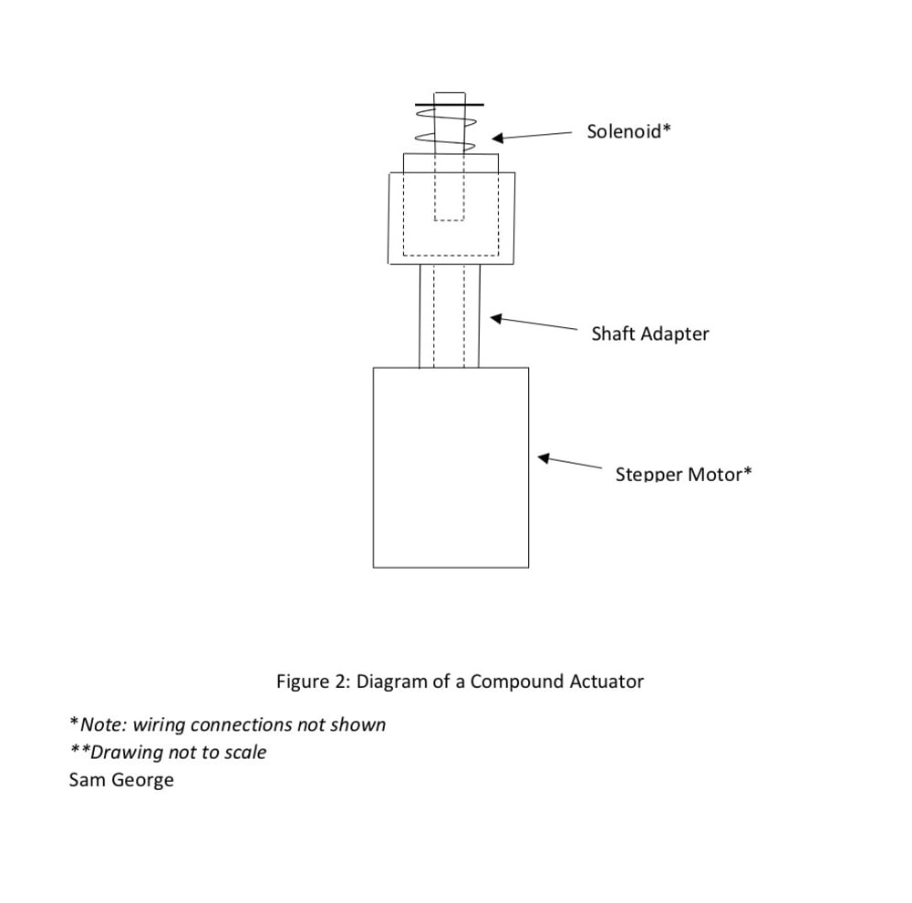 The electronic system consists of the following components: the microcontroller module, the Tri-motor controller module, the switch matrix, 3 bipolar stepper motors and 3 solenoids. Through the position of its 8 switches (where each switch is active low) the switch matrix directs the microcontroller to drive the motor controller board, which in turn drives the stepper motors and the solenoids in a specific sequence in order to mimic various human-like reactions. Each stepper motor and each solenoid can be driven independently. As shown in Figure 1, the motor controller board requires a 24 Volts DC power supply and a 5 Volts DC power supply to operate because each integrated H-bridge driver IC has a digital logic circuit and a power circuit. On the motor controller board, there are three stepper motor controller ICs, where each controls one integrated H-bridge IC. Each H-bridge IC, in turn, controls its corresponding stepper motor. Each solenoid is driven by a low-side NMOSFET, which is controlled by the microcontroller. In the implementation of a robotic head, one stepper motor is mechanically coupled to one solenoid, via a shaft adapter, to form a compound actuator. The compound actuator is the fundamental element of the robotic head. As shown in Figure 2, the solenoid is fixed onto the shaft adapter. The adapter then is fixed onto the shaft of the motor. Each compound actuator is assigned an axis (x-, y-, or z-) on which the corresponding motor’s shaft will rotate. For example, one actuator is assigned the x-axis, where the motor’s shaft will rotate (clockwise or counterclockwise) on the x-axis. The actuators are mounted onto a wooden frame, as shown in Figure 3, and support the headpiece.