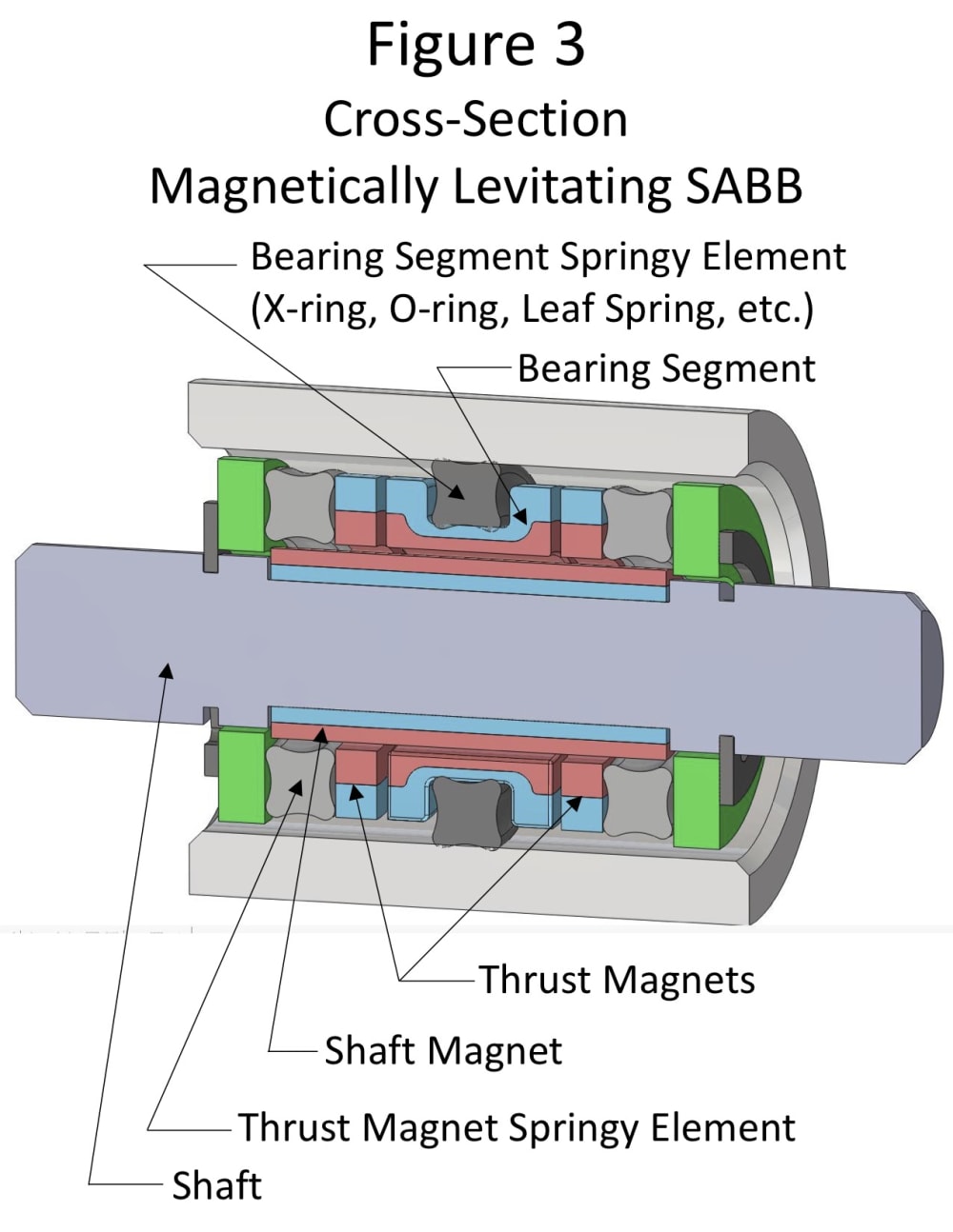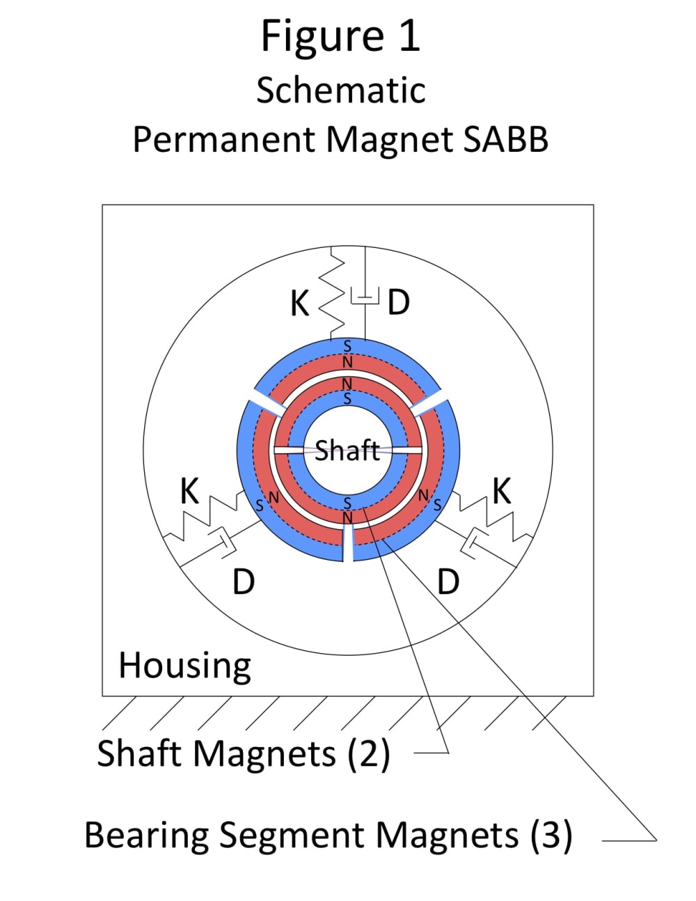 In 1842 British mathematician, Samuel Earnshaw, demonstrated that you could not make a magnetically levitating bushing bearing through the use of permanent magnet repulsion alone because the magnetic force falls off non-linearly as an inverse square of the distance, known as the “Earnshaw’s Theorem”. For example, if you double the gap between repelling permanent magnets, the repulsion force is only 1/4th as strong. However, when configured as shown in Figure 1, in which the inside surface of the Bearing Segments are the same permanent magnet polarity as the outside surface of the magnets attached to the Shaft, a Springy Element can be selected to provide a stabilizing resilience to overcome Earnshaw’s Theorem.