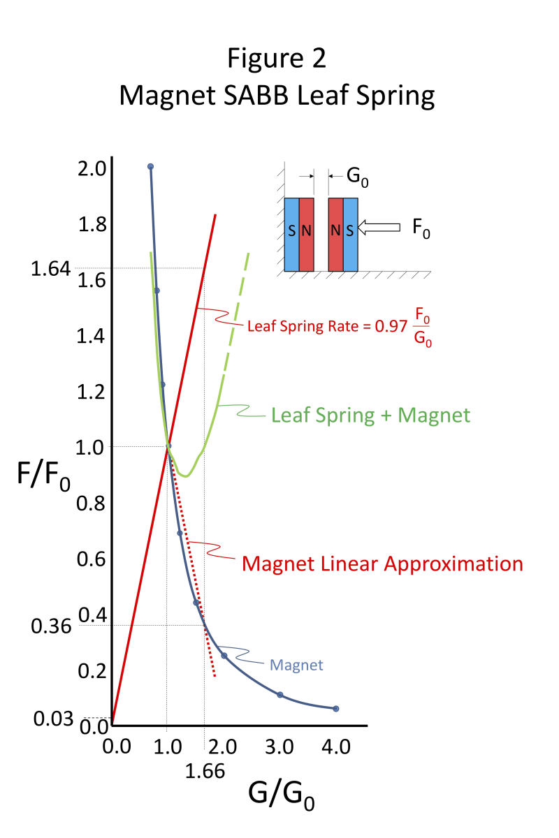 Figure 2 is a graph of ratios of the change in force F/F0 vs. change in gap G/G0 for a Permanent Magnet SABB in which the springy element is, for example, a leaf spring. G0 is the initial gap between the Bearing Segment Magnets and Shaft Magnets, and F0 is the initial magnetic repulsion force at Gap G = G0. The figure shows how the repulsion force ratio Fm/F0 of the magnets falls off as the inverse square of the change in gap ratio G/G0. The figure shows that the magnetic force ratio Fm/F0 is approximately linear from G/G0 =1 to G/G0 = 1.66 such that a Leaf Spring could be designed with an Fs/F0 vs. G/G0 relationship that mirrors the Fm/F0 vs. G/G0 of the magnets such that the combined magnetic and Leaf Spring force (Green curve) is dynamically stable.