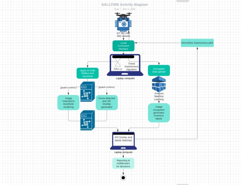 An autonomous drone package containing 5 drones, a fast charging base station, and mobile uplink is delivered to the job location. Each drone captures a live 3-D 360 Lidar image while it caries out a survey of the construction site, while also running a program that safely responds to voice commands and obstacles. The data collected by the SALLYs is transmitted through the base station to a cloud server that compares the current jobs to the CAD drawings. By focusing on a modular design using readily available parts, we can maintain a diverse job portfolio with a high number of affordable droids. Each Sally CPU is coded with an evolving OS for security and resilience.