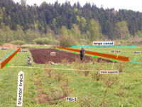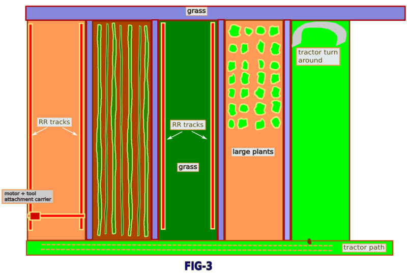 Fig. 1 shows small section of farm field, about 13m wide between ditches and over 50m long. railroad tracks, RRtrack, would be mounted on vertical supports made of wood or concrete pillars pushed into the ground. Wasted plot section used for tractor track.