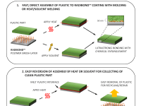 The assembly between a coated polymer brush surface and a plastic or fiber reinforced plastic composite is achieved by melting the plastic in the interface, typically by welding or molding. The bonding can again as easily be reversed by remelting the plastic in the interface to break the chemical entanglement bond and get clean parts that can be recycled or reused.