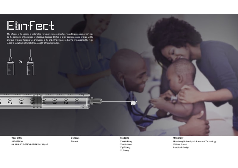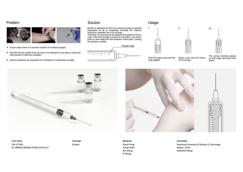 Elinfect is designed to force the vaccine syringe to become disposable so as to completely eliminate the infection caused by repeated use of the syringe. Therefore, two protrusions are added to the bottom of the syringe. When the syringe is pushed to the bottom, the protrusions on both sides limit the extraction of the piston, making the syringe unusable.