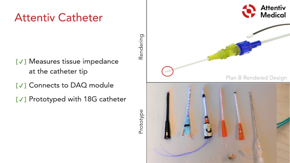 Our device will enable accurate and early detection of IV infiltration through monitoring catheter dislodgement, reduce the workload of the patients’ caretakers by creating a reliable and intuitive alert system, and improve patient safety and outcomes through reliable detection. The Attentiv Catheter utilizes embedded sensors sensitive to tissue property changes at catheter tip, a unique algorithm for signal processing and reliable classification of IV infiltration events, and a monitoring system for caretakers that incorporates portable notification tools for active monitoring.