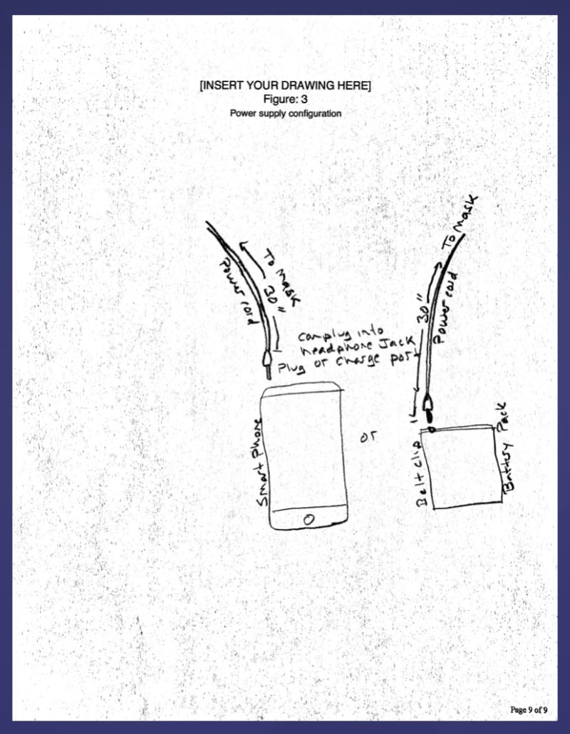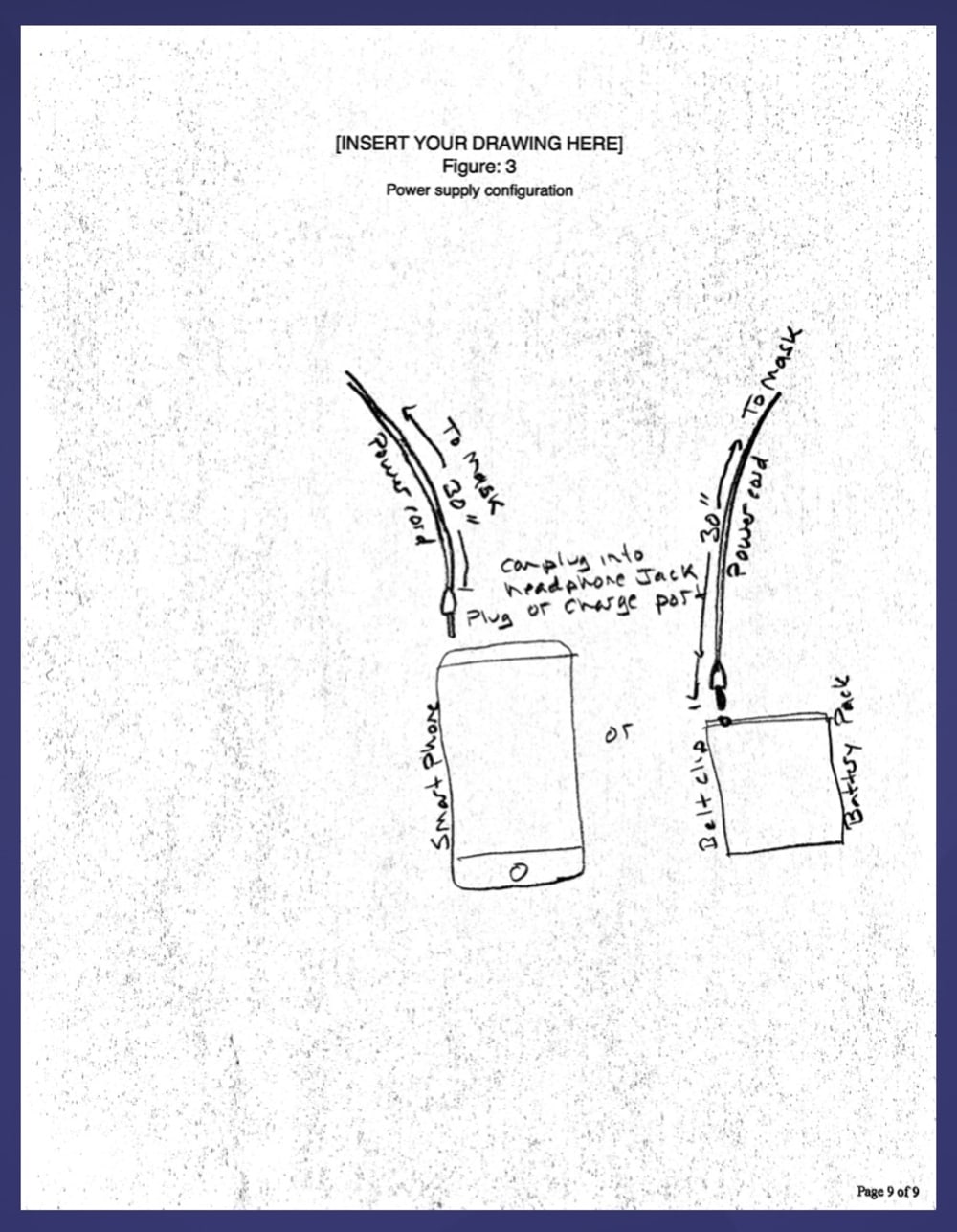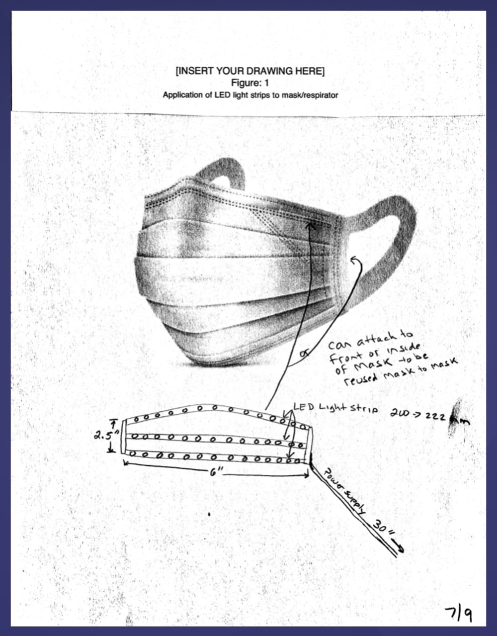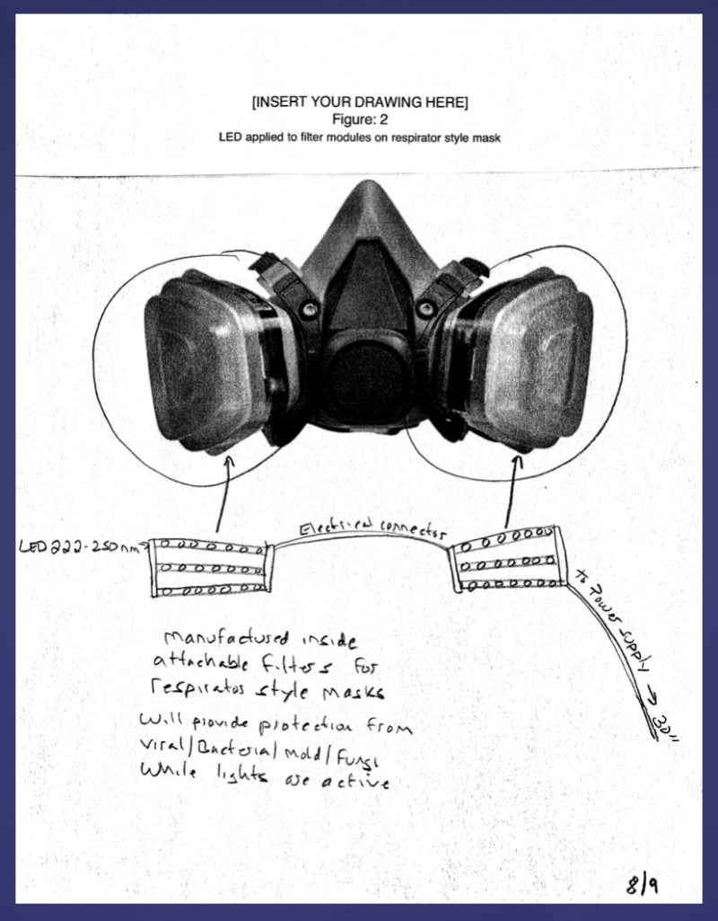 Utilizing LED light strips powered from a stand alone battery pack or directly from a smart phone. UVC wavelengths in the range of 200nm to 222nm have been shown to be effective at kiling viruses and bacteria while remaining safe for human skin. The device consists of three strips of LED in the specified wavelengths that have a reusable, stick backing that can be attached to a disposable cloth face mask of many varieties, from a basic surgical mask to N95 style masks. It can also be manufactured inside disposable filter packs designed to be attached to respirator style masks. Either method greatly increase the Anti-Viral properties. The Devices is approximately 6" long and the 3 strips are separated by approximately 2" and should be place one above the nose, one just below the nostrils and one below the mouth on the mask. (see Illustrations) The device has a 30" power cord that can be plugged into a smart phone to power the low draw LED lights or it may be plugged into a separate battery pack. The disposable filter attachments for respirator style masks may utilize wavelengths above 222nm to 255nm, which are proven effective at killing viruses and bacteria, but are more hazardous to human skin, but would be contained within the filter, eliminating exposure risks.