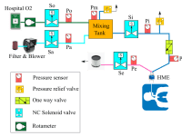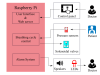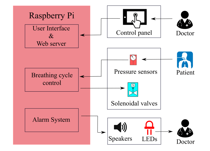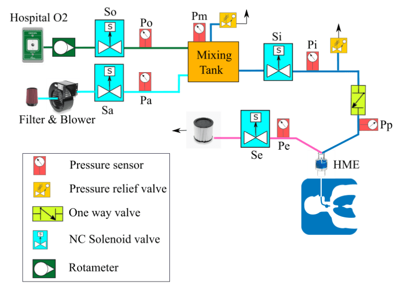 The system consists of two gas inlets for hospital supplied O2 and ambient air supplied through a blower assembly respectively, a mixing tank with safety valves, sets of solenoid valves and pressure sensors, humidity exchanger, filters and standard inhalation/exhalation tubes with a Y-connector. A low cost processor (Raspberry Pi) monitors the pressures at six stations in the circuit and operates on four proportional solenoid valves using standard control mechanisms, such as pulse width modulation (PWM) and proportional-integral-derivative control (PID). This enables the ventilator to operate both pressure and volume controlled modes with a variety of breath sequence modes such as Assist Control (AC), Synchronized Intermittent Mandatory Ventilation (SIMV), Spontaneous/Timed (S/T) ventilation mode combined with patient inspiration triggers, as well as the Continuous Positive Airway Pressure (CPAP) mode.