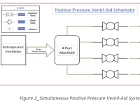 A schematic of the positive pressure Ventil-Aid system is shown in Figure 2. The first component attached to the rotodynamic ventilator is a manifold. The manifold is just a fluid splitter with one main entrance and four exits, which allows to maximize one fluid ventilator up to four patients or more depending on the volumetric flow and pressure characteristics of the rotodynamic ventilator. This simple idea (please see video) will allow maximizing all the resources in terms of the number of "Fluid Ventilators" available, since one Fluid-Ventilator could easily feed in parallel several patients at the same time.
