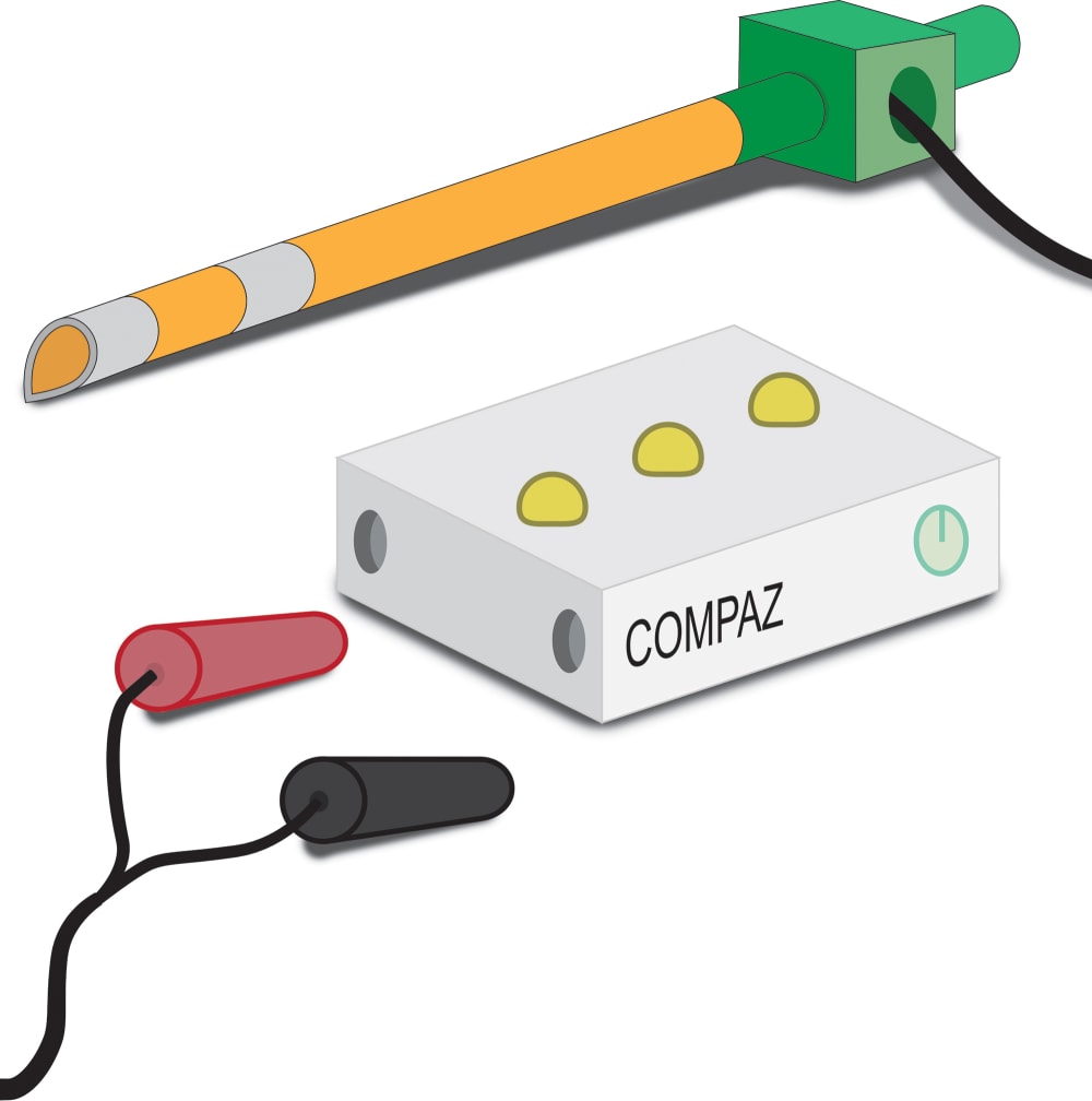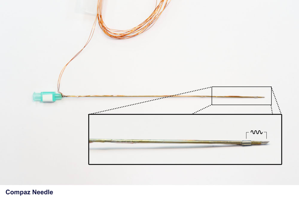 Innovation: The Compaz Needle system, developed by inventors at the Texas Heart Institute and Baylor College of Medicine, is comprised of a functionalized micropuncture needle that can be connected to a portable impedance analyzer that monitors real-time impedance that will supplement the existing access technology to prevent pneumothorax. Micropuncture needles have been attributed to a significantly reduced complication risk in comparison to their large bore counterparts. Electrical bioimpedance is measured at the distal tip of the needle, providing specific and spatially localized impedance feedback. Because tissues in the body have unique impedance values, the feedback from the needle can be used to distinguish the tissue surrounding the needle tip. Importantly, since the lung comprises primarily of air, we have shown that the Compaz Needle can clearly distinguish lung from surrounding tissues based on the impedance values. In the studies we have conducted impedance of lung could be differentiated from surrounding tissue with a sensitivity of 98% and specificity of 90% (AUC = 0.99). By indicating that the tip has just entered a lung space, the operator is notified by the Compaz Needle system and can retract and redirect the needle away from the lung. This will prevent a larger catheter or any such device from entering the lung and creating a pneumothorax. Not only can the needle help to avoid the costly complication of a pneumothorax, but it can help ascertain venous access based on the impedance measurement. We have demonstrated that the needle can differentiate the blood in a vessel from any other tissue with a sensitivity of 85% and specificity of 87% (AUC=0.87).