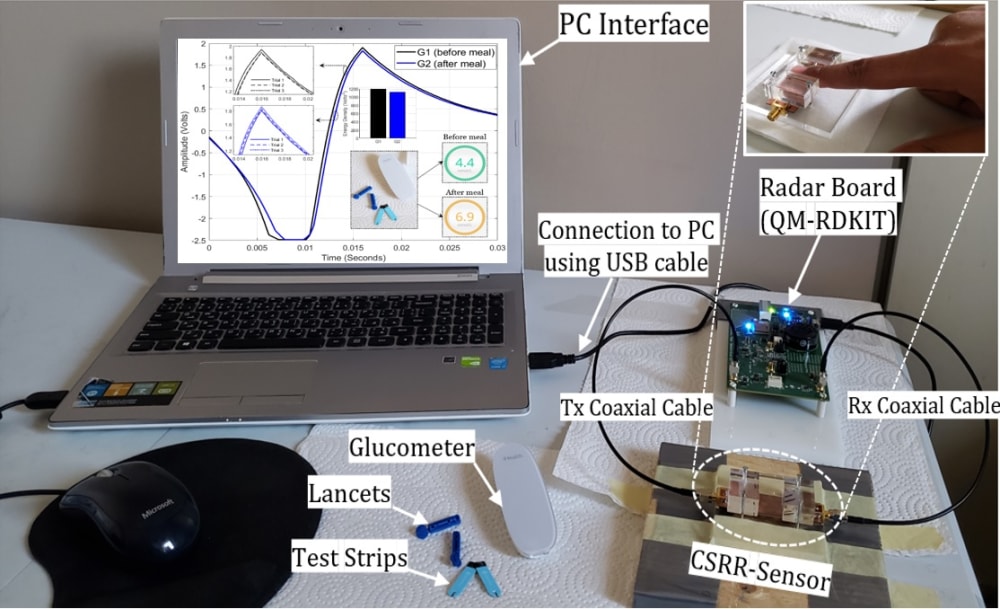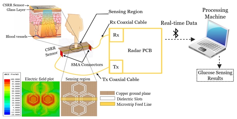The sensor has proved the efficacy in identifying changes of glucose levels through detecting minute variations in their electromagnetic properties. This is done by experimenting several prototypes for monitoring the varying glucose level in synthetic and authentic blood samples of concentrations typical to the diabetes conditions. The portable prototype shown in illustration 2 has been developed and tested for tracking the glucose levels for healthy adults by placing their fingertips onto the sensor. The sensor design incorporates four cells of complementary split ring resonators (CSRRs), arranged in a honey-cell configuration and fabricated on a thin sheet of a dielectric substrate. The CSRR elements are coupled via a planar microstrip-line to a radar board operating in the ISM band 2.4–2.5 GHz. The enhanced design of the CSRR elements intensifies the electric field over the sensing area in the near-field region, thus allowing the sensor to detect small variations in the electromagnetic properties that characterize the varying glucose levels. Therefore, placing the fingertip over the sensing region would consequently perturb the distribution of the highly concentrated electric field, and further induce noticeable changes in the sensor transmission response. These responses are analyzed using machine learning algorithms to extract the glucose features and correlate them to the actual blood glucose level.
