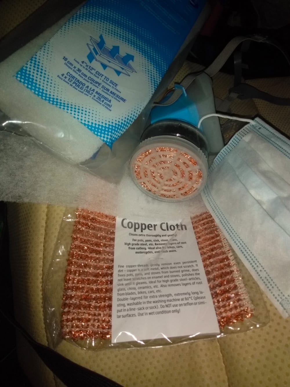 A solution to these limitations involves the addition of additional layers to the mask consisting of common loose-weave copper ribbon cloth, separated by self-charging insulating filters as used in heating vents, etc. The copper cloth is connected to an external battery to establish a stable charge potential under varying usage gradations of moisture and contaminants. Air restriction is not significantly increased by the addition of these layers, and electron activity between active copper ions and biological structures contacting the copper by vector or electrostatic collision will disrupt the virus efficacy by dismantling the viral molecular bonds. Key to the design is the use of external battery (or boost-circuit) voltage to increase and stabilize charge-potential between the copper cloth 'plates' through which biological material must pass. The filtering/capturing effect is symmetrical for virus-bearing aerosols passing in either direction.
