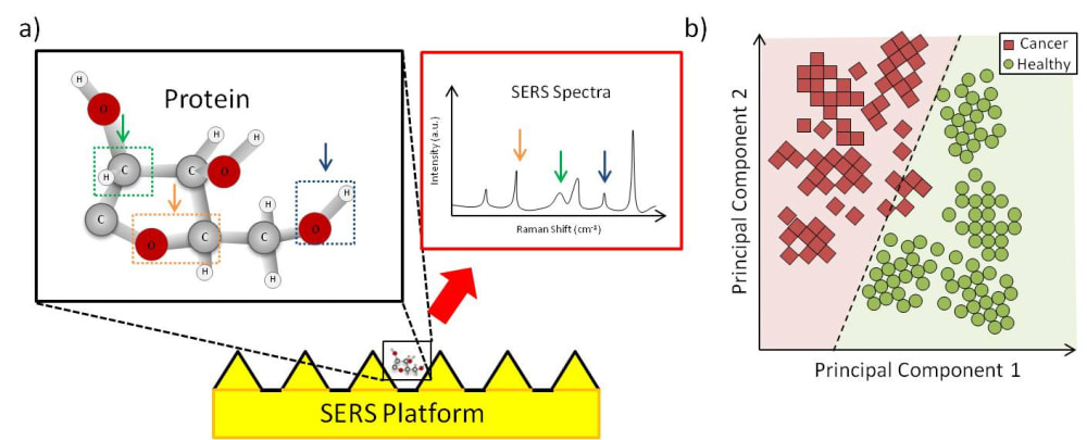 The eXoutcancer system is a combination of a nanochip and a proprietary spectroscopic database derived from a machine learning (ML) algorithm. The biomarker we are detecting is called an exosome. Cancer cells release a larger quantity of exosomes which are found throughout various cancer stages. Other cancerous biomarkers, such as cell-free DNA (cfDNA), can also be found in the blood, but these exist in significantly lower concentrations in early cancer stages, making them much harder to detect. Because the exosome is a routine cellular process, it’s found throughout each cancer stage. A key advantage of the eXoutcancer system is this combination of a nanochip and a technique called surface-enhanced Raman spectroscopy (SERS). When a laser is scanned across the chip’s surface, any exosome near the nanofeatures gets its signal enhanced giving our platform the ability to measure at the single exosome level. This translates to extremely high sensitivity and specificity, even at low concentrations. The complex spectroscopic data is parsed out via an ML algorithm to develop this diagnostic fingerprint.