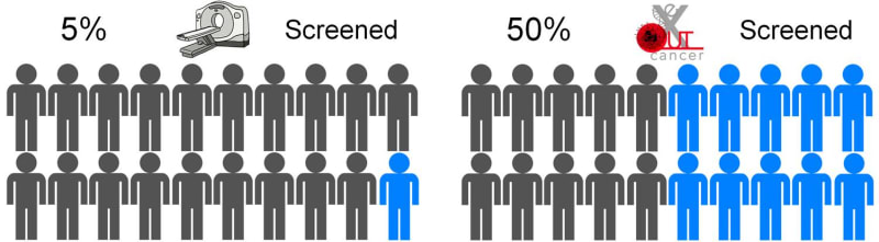 In the US, the high risk population for lung cancer is around 5-8 million people. The current early lung cancer screening modality is a low-dose CT scan, costing around $300 per scan; and due to various reasons, such as socioeconomic factors, low-dose CT scans have only been able to effectively screen 5% of this high risk population. A routine blood test is expected to overcome this stigma, increase testing availability and significantly lower overall diagnostic costs --all this while actually achieving 10 times more screenings.