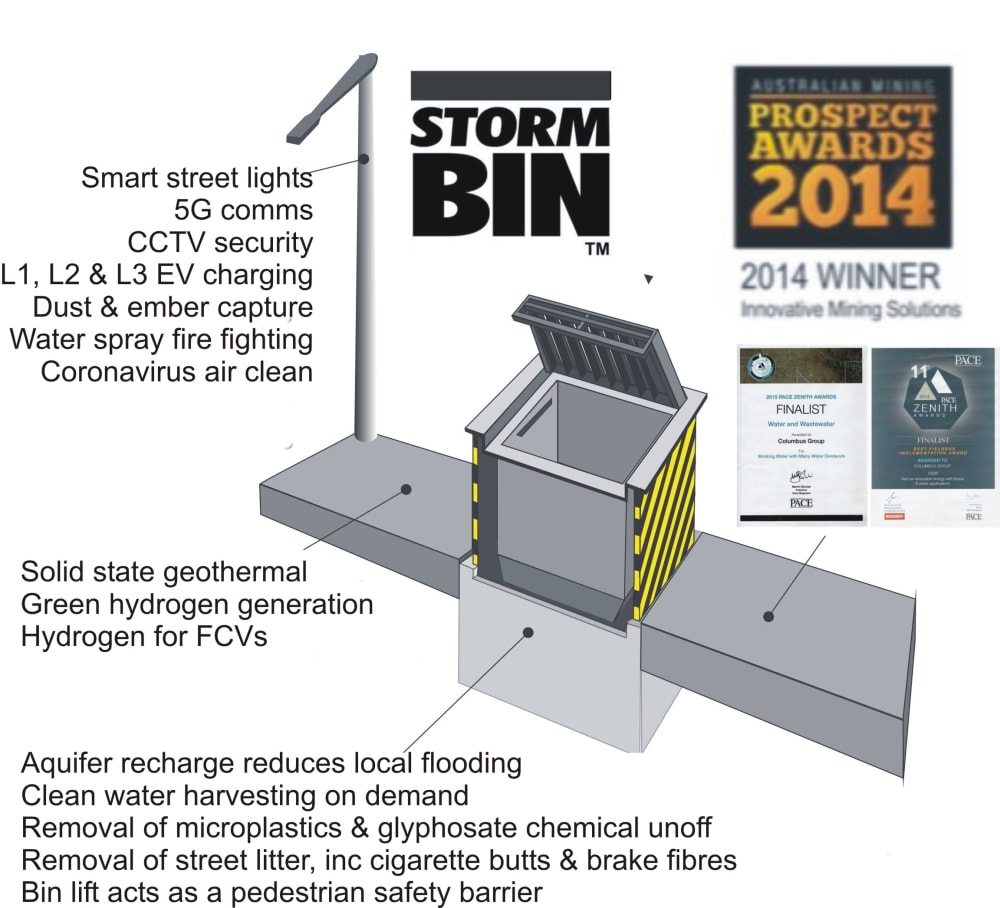Bringing it all together, the various elements are installed in a common storm water management retrofit installation called STORMBIN, cleaning up the street of litter, leaves and even microplastics and glyphosate, with the storm water being pumped down to recharge the underground aquifer for later clean water harvesting on demand.