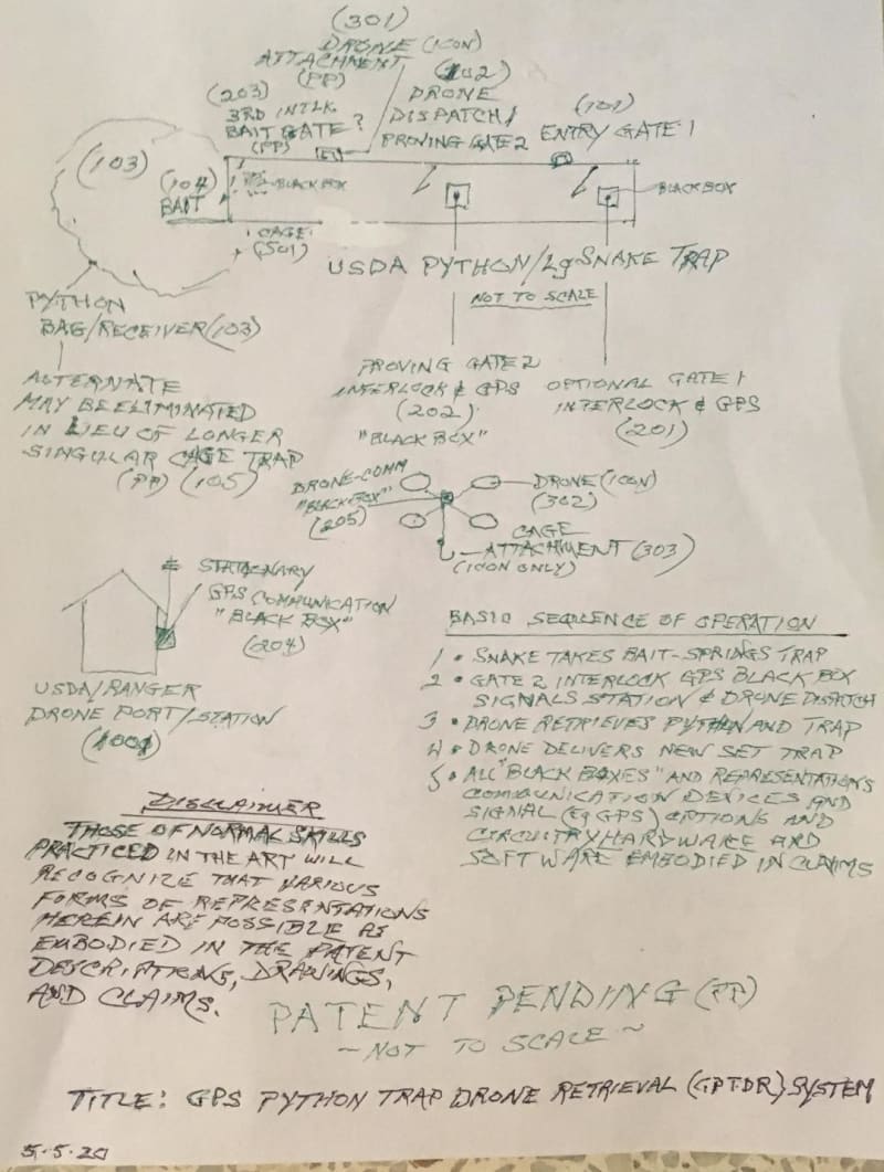 This GPS Python Trap Drone Retrieval System will make the capturing of Burmese Pythons in the Florida Everglades viable and efficient. The snakes are devastating mammal wildlife in the Florida Everglades, and seriously jeopardizing the ongoing restoration of our amazing 'River of Grass.' There is only 1/3 of the original Everglades still left in existence. To date efforts to capture significant numbers of pythons has been largely unsuccessful. E.g., 1,000 hunters caught 68 pythons in one hunt.