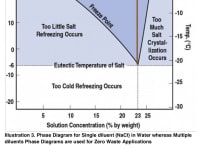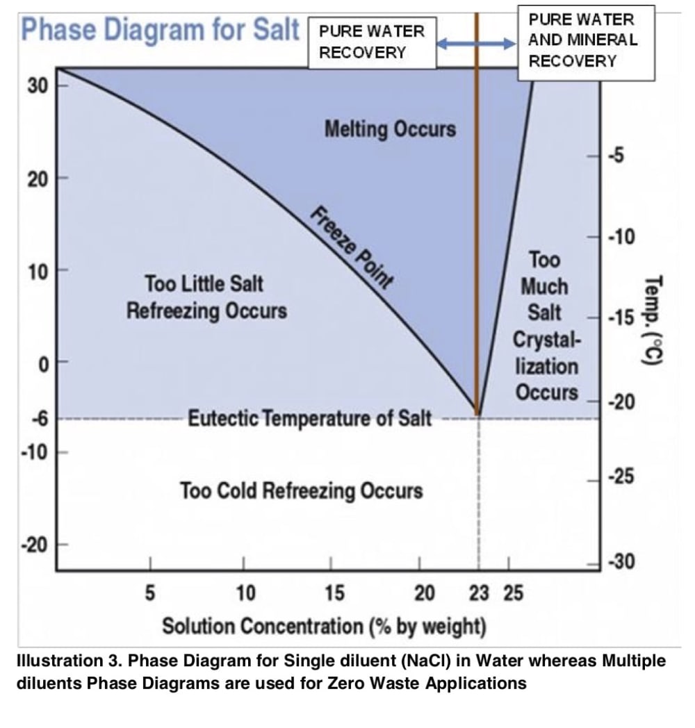 Illustration 3 shows how the phase diagram for NaCl salt in water is used to recover fresh water when the input concentration is less than 23% and to recover fresh water AND salt when the input concentration is more than 23%. For waste waters with multiple diluents with different eutectic temperatures and eutectic concentrations, a stage process is used to crystallize each impurity for collection and sale. Ultimately, zero waste becomes available.